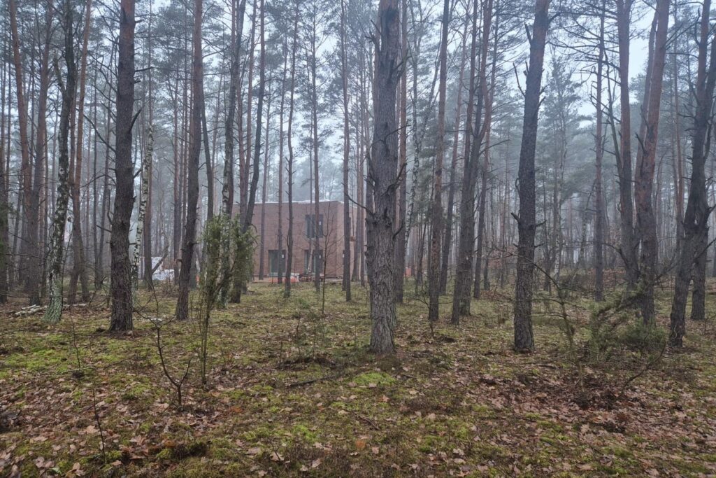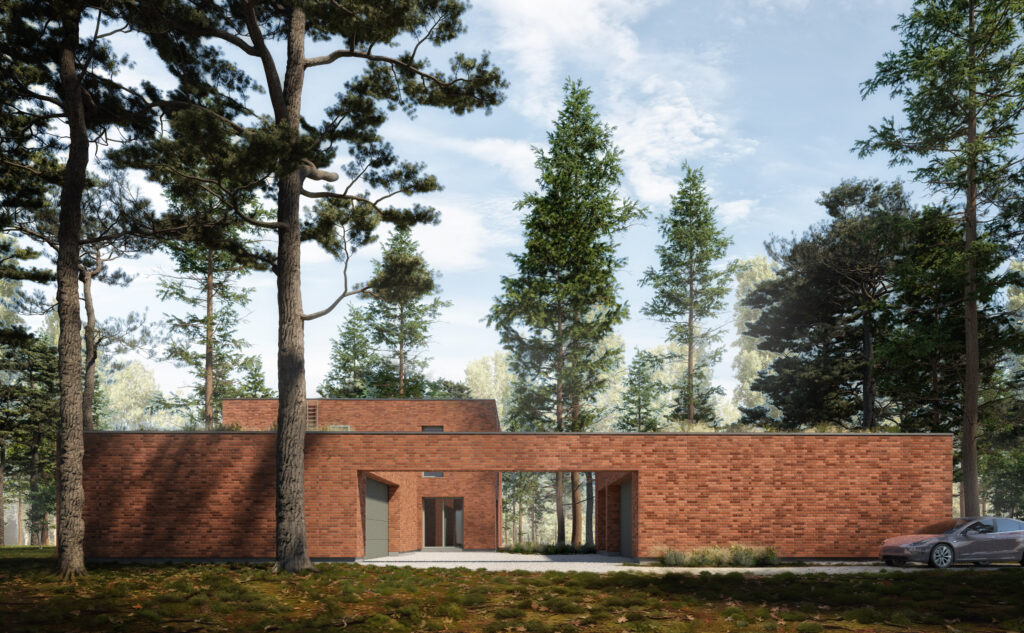 Materiały wykończeniowe — cegła naturalna, stolarka w barwie szałwii, dachy zielone — zostały dobrane w taki sposób, aby budynek harmonijnie wpisywał się w krajobraz i lokalny kontekst historyczny. Całość utrzymana jest w palecie neutralnych, nienachalnych barw, zgodnych z wytycznymi obowiązującymi w strefie ochrony konserwatorskiej.