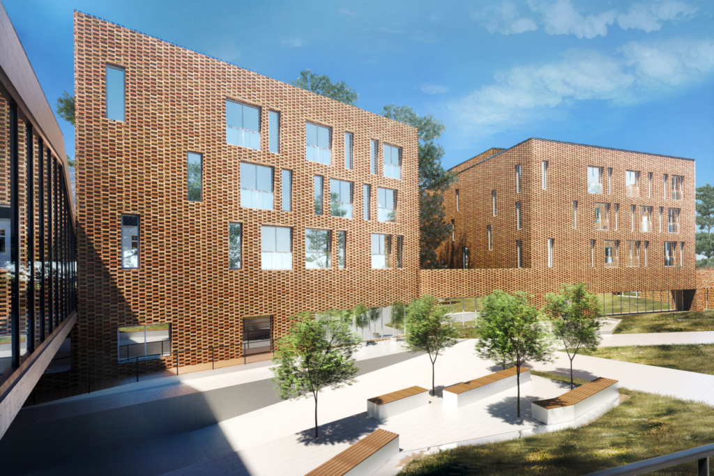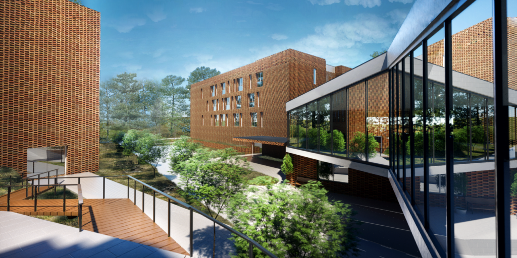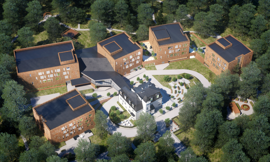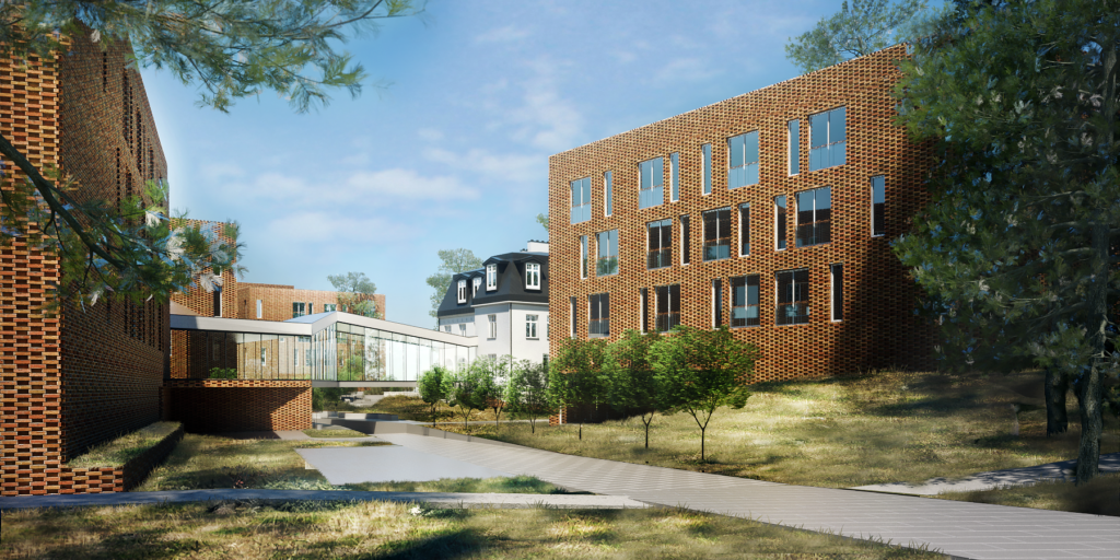 Nowa zabudowa uzupełnia istniejący obiekt, zachowując jego rangę i skalę otoczenia. Pawilonowy układ, zielone dachy i stonowana kolorystyka tworzą spójne, humanistyczne środowisko, a ażurowe łączniki podkreślają czytelny podział między częścią historyczną i współczesną.
